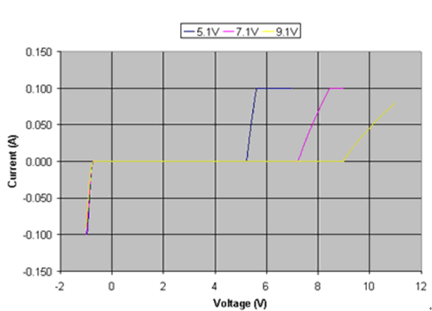 圖2:具有不同的反向擊穿電壓的穩(wěn)壓二極管的I-V曲線圖。電壓值是n區(qū)相對于p區(qū)的電壓