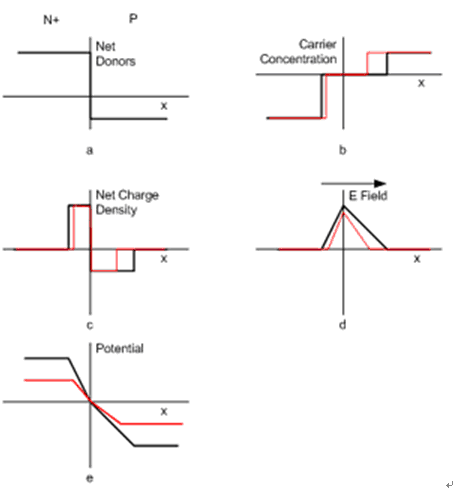 二極管的特性可以通過如圖1所示的突變型PN結(jié)來做深入理解??紤]到兩片硅材料,一片是重?fù)搅耸┲麟s質(zhì)的n+硅,一片是輕摻了受主雜質(zhì)的p硅。如圖1a所示那樣我們在x=0處將它們結(jié)合。n+區(qū)域電子密度等于施主雜質(zhì)的數(shù)目,而P區(qū)域認(rèn)為空穴密度等于受主雜質(zhì)濃度,但這種靜態(tài)情況將不會持續(xù)。在PN結(jié)邊界處電子將和空穴重新結(jié)合,結(jié)果是導(dǎo)致在PN結(jié)連接處的區(qū)域電子和空隙全被耗空。這就是圖1b所示的耗盡層,或者說是零載流子濃度區(qū)域。在這個連接處區(qū)域隨著載流子濃度的耗盡就成為靜電荷區(qū)域,如圖1c。在橫坐標(biāo)零點(diǎn)左邊,由于電子和右邊的空穴中和從而只剩下帶正電的靜電荷;在零點(diǎn)右邊,由于空穴和左邊的電子中和從而只剩下帶負(fù)電的靜電荷。在PN結(jié)連接處的兩邊耗盡區(qū)的寬度依賴于兩邊施主雜質(zhì)和受主雜質(zhì)各自的摻雜濃度。有個物理現(xiàn)象是PN結(jié)耗盡區(qū)總的正電荷數(shù)和負(fù)電荷數(shù)一樣,所以PN總體還是呈現(xiàn)不帶電狀態(tài)。 PN結(jié)連接處摻雜濃度高的一邊的耗盡層寬度比摻雜濃度低的一邊要窄得多。 耗盡區(qū)一定的靜電荷密度的存在產(chǎn)生了一個電場,其場強(qiáng)最大的地方是PN結(jié)連接處,如圖1d所示。PN結(jié)的電場存在產(chǎn)生了內(nèi)建電壓差,如圖1e所示。電場和電壓的存在會迫使電子向n區(qū)域移動,而空穴向p區(qū)移動。