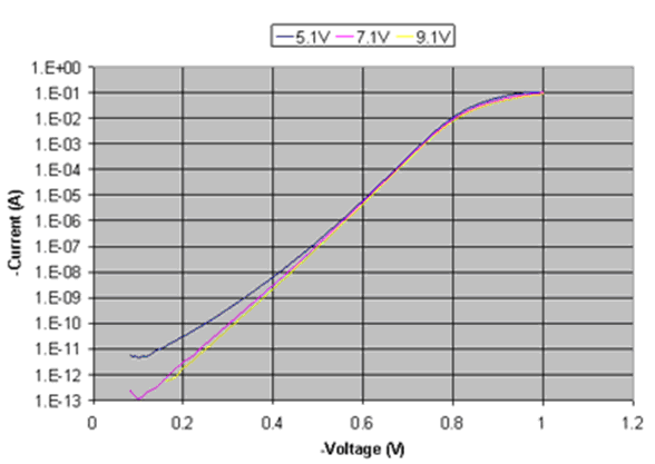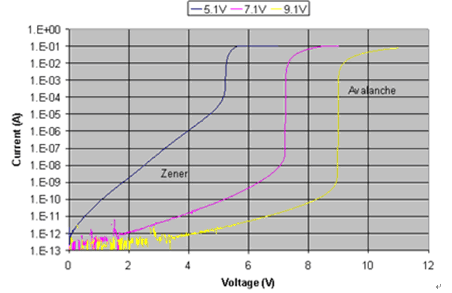 在高摻雜濃度下第二次擊穿發(fā)生。在高摻雜濃度下,電場變得太強(qiáng)以致電子從本質(zhì)上遠(yuǎn)離原子成為完全自由載流子。這個過程就是大家所知的齊納擊穿(在半導(dǎo)體中的一種非破壞性擊穿),這常常被描述為電子從禁帶到導(dǎo)帶的量子隧穿。齊納擊穿的電流相對電壓增長相對5.1V二極管的雪崩擊穿有一個更大的斜率,如圖6所表示。