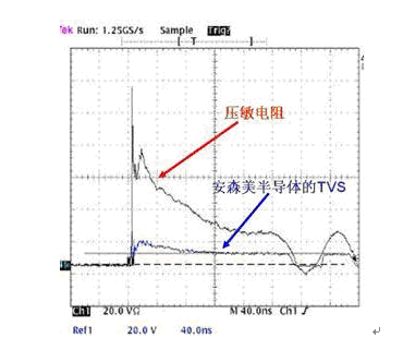 圖3: TVS元件與壓敏電阻在8kV IEC 61000-4-2應(yīng)力沖擊測(cè)試下的輸出波形對(duì)比