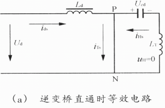 在負載短路時,逆變橋囚侵入干擾信號而產(chǎn)生直通短路,逆變橋輸入電壓突降為零。這時,原來儲藏在濾波電感Ld中的磁能和隔直電容Cd中的電能均分別以短路電流ids和iHs的形式向逆變電路釋放,等效電路圖為圖2(a)所示。橋中IGBT流過的短路電流is為