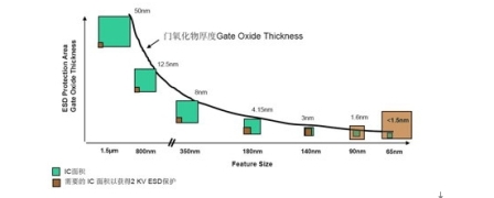 圖4 隨著IC面積的不斷減小,很難在IC中集成ESD保護(hù)電路(資料來(lái)源:安森美半導(dǎo)體)