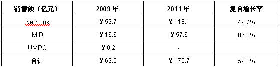 表1 2009-2011年中國超移動筆記本電腦市場銷售額預測