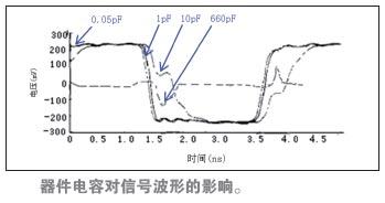 傳輸速率為12Mbps時,其保持電平的時間要長得多(80ns)。在此數(shù)據(jù)傳輸率條件下,1OpF或更小的電容值將使得數(shù)據(jù)通過時的失真最小。當(dāng)傳輸速率提高到480Mbps時,信號具有短得多的電平保持時間(2.0ns)。此時1OpF電容的ESD抑制器件已經(jīng)引起波形失真:它減少了電平保持時間并使前沿和后沿的形狀大為改變。而660pF電容的ESD抑制器件則造成了相當(dāng)大的失真,以致于波形甚至無法達(dá)到信號工作電壓。圖1顯示了不同ESD抑制器件對480Mbps數(shù)據(jù)波形的影響。