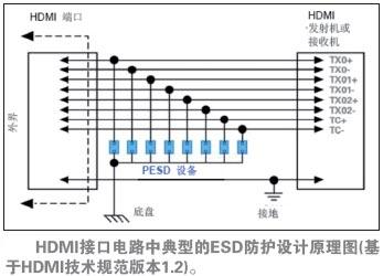 圖6.HDMI接口電路中典型的ESD防護設(shè)計原理圖(基于HDMI技術(shù)規(guī)范版本1.2)。