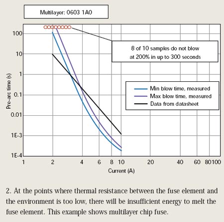 若熔斷元件和環(huán)境間的熱阻抗過(guò)低,將沒有足夠能量融化熔斷元件。這將使保險(xiǎn)絲不能在120秒內(nèi)切斷相當(dāng)于額定電流兩倍的過(guò)載電流。圖2和圖3說(shuō)明了多層片式保險(xiǎn)絲以及激光調(diào)割厚膜芯片保險(xiǎn)絲的這種情況。
