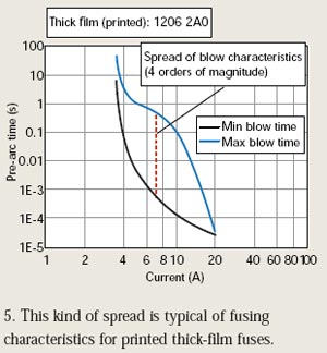 源于這種阻值變化,芯片保險(xiǎn)絲可能在正常浪涌電流條件下熔斷?;蚍催^(guò)來(lái)說(shuō),它也可能在過(guò)載條件下需要熔斷時(shí)而沒能熔斷。當(dāng)然,這是工程師必須避免的最壞情況。圖5顯示了印刷厚膜保險(xiǎn)絲熔斷特性的典型擴(kuò)散。