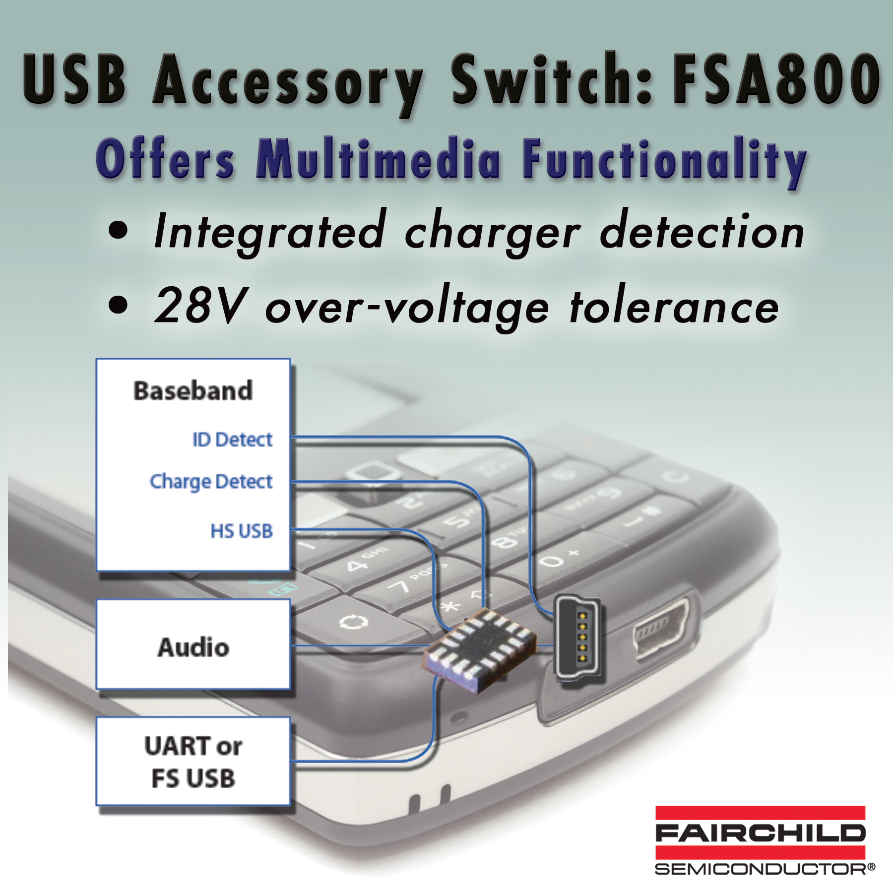 飛兆半導體公司 (Fairchild Semiconductor)為手機、PDA和MP3播放器設(shè)計人員提供全新USB附件開關(guān)產(chǎn)品FSA800。FSA800是業(yè)界最小的器件,將所有主要的多媒體功能集成進薄型UMLP封裝(1.8mm x 2.6mm x 0.55mm)中。它具有內(nèi)置充電檢測功能、28V的過壓容差、內(nèi)置終止電阻器,以及負擺幅功能。通過在緊湊型封裝中集成了多種功能,可以簡化便攜設(shè)計并減少外部元件數(shù)目。