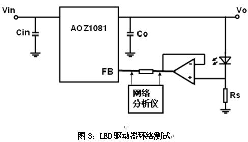 這樣,就必須引入一種隔離的電路,使注入的信號不影響電源系統(tǒng)的正常工作。通常,電壓跟隨器具有阻抗變化,也就是其輸入相當(dāng)于開路,輸出相當(dāng)于短路,同時(shí),時(shí)還具有緩沖的作用,也就是在信號源和負(fù)載之間緩沖,將輸入信號無損耗的輸出。因此,可以使用圖3的電路測量LED驅(qū)動器的環(huán)路穩(wěn)定性。