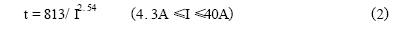 由表1可知,RXE系列PolySwitch元件所能承受的最大電流為40A。該點與臨界點之間為曲線的直線部分。設(shè)動作時間為t(秒),故障電流為I(安),考慮到橫軸、縱軸均為對數(shù)坐標(biāo),兩者之間應(yīng)具有如下數(shù)學(xué)關(guān)系: