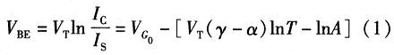 式中VG為帶隙電壓,γ和α為器件參數(shù),A代表了那些方程推到過(guò)程中與溫度無(wú)關(guān)的常量。因?yàn)閂t=kt/q,可以得到VBE隨溫度上升是降低的。其關(guān)于溫度變化的方程為