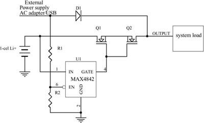 另外,MAX4842的過壓保護門限為4.4V-5.0V,也高于單節(jié)鋰電的4.2V上限電壓。電源切換電路是利用MAX4842的使能控制引腳/EN配合分壓電阻R1/R2實現(xiàn)的。當沒有外部電源接入時,如果電池電壓高于2.8V-3.2V的保護門限,/EN被R2拉低,MAX4842驅動Q1、Q2的柵極為高電平使其導通,電池為負載供電;當有外部電源接入時,通過R1/R2分壓后在/EN引腳上產生的電壓高于1.47V后MAX4842被禁止,Q1、Q2被關閉,由外部電源給負載供電。圖中的二極管D2用于阻斷灌入外部電源的反向電流,并防止/EN被錯誤拉高。由于它串在外部供電通路上,損失一點效率沒有關系。