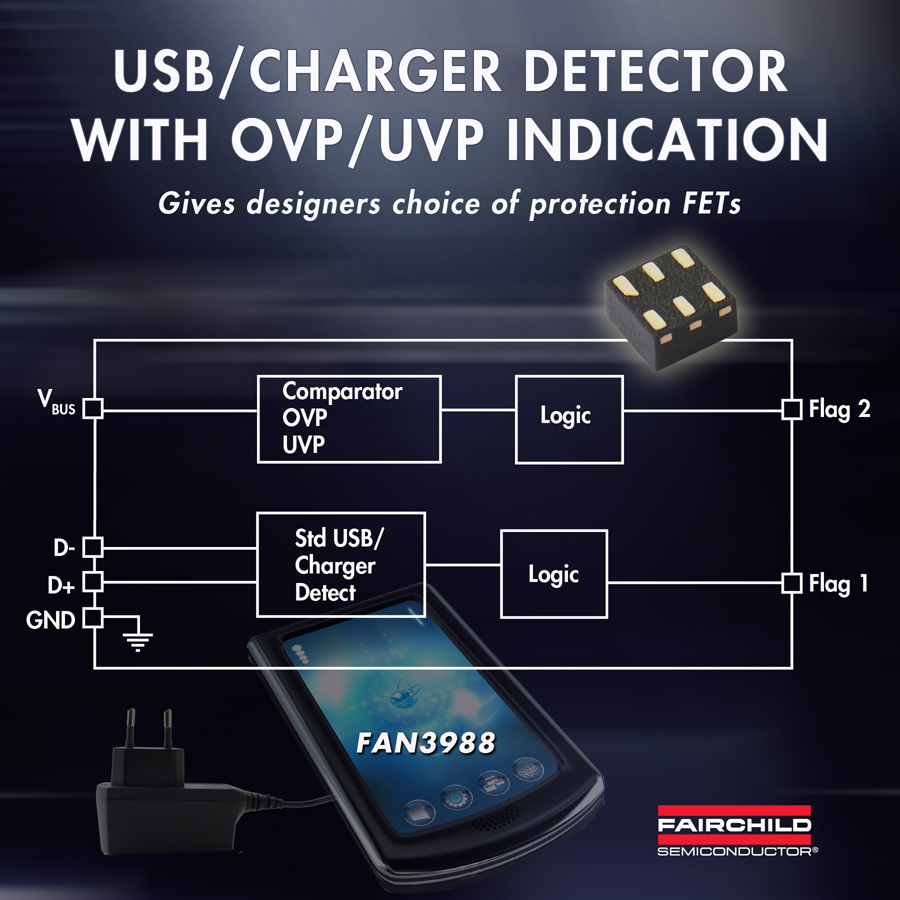 FAN3988具備內(nèi)置自動檢測功能,器件通過連續(xù)監(jiān)控短路條件下的D+ / D-線,能夠感測是否連接USB充電器。此外,器件還通過監(jiān)控VBUS來感測過壓或者欠壓狀況。當達到過壓閾值時,F(xiàn)AN3988立即禁用外部P溝道MOSFET。這些功能減小了設(shè)計的復(fù)雜性,并省去外部電路,節(jié)省了線路板空間。這款新型OVP器件是滿足新興過壓保護標準要求的理想選擇,對于手機尤為適合。