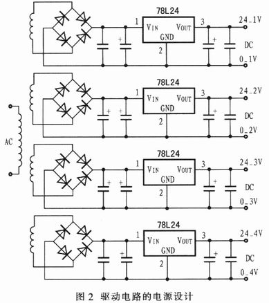 驅動電路需要4路相互隔離的直流電源為4路IGBT驅動電路供電,用220V/22V變壓器對4路交流電源分別整流,用電容器和78L24型電壓調整器穩(wěn)壓后輸出4路24V直流電壓,如圖2所示。