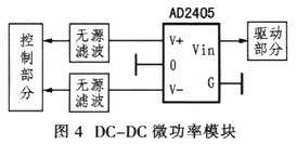 控制電路為弱電部分,極易受到干擾;驅動電路直接與外電路連接,是一個較強的干擾源;為了實現整個設備的電磁兼容,控制電路部分必須與驅動部分隔離。為了避免公共電源對控制電路產生干擾,應對控制電路及驅動電路分別供電,EXB84l的電源電壓為+20V,一般控制電路的供電電壓為5V,因此,可以利用圖4所示的DC-DC微功率模塊進行電源隔離,采用A2405D型微功率模塊實現電源的隔離。