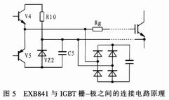 圖5所示為EXB841與IGBT柵-射極之間的連接電路原理圖。當驅動電路中的V4導通時,IGBT處于正常導通狀態(tài),當V5導通時,IGBT柵-射極之間通過穩(wěn)壓管VZ2提供一個-5V電壓加在其兩端,使IGBT關斷,此時V5處于臨界導通狀態(tài),穩(wěn)壓管VZ2處于反向偏置狀態(tài)。但由于集-柵極之間分布電容的影響,集-柵極之間的du/dt增大時,其通過分布電容形成的電流經過,所以,要克服集-柵極之間的du/dt,確保穩(wěn)壓管不過壓,避免IGBT誤導通??朔u/dt的方法有二種:一是驅動電路輸出與IGBT柵-射極之間的連線采用雙絞屏蔽電纜,屏蔽層接地,二是采用快速吸收電路吸收過電壓。