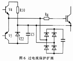 在實際應用中,僅靠EXB841的6引腳檢測IG-BT集電極電壓來實現過流保護并不足以有效地保護IGBT,因此有必要在主電路中加接霍爾電流傳感器來檢測電路中的過流,如圖6所示。過流發(fā)生后,檢測電路檢測到電流,延時8μs后信號還存在的話。封鎖驅動信號以關斷IGBT。在圖中,霍爾電流傳感器如果在主電路中檢測到過流信號,其中的PNP三極管將導通,同時,NPN三極管被截止,EXB841的6腳被懸空;當沒有過流信號時,PNP三極管不導通,NPN三極管導通,此時電路等效于擴展前的電路。