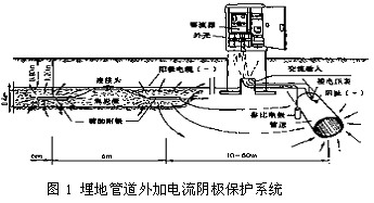 從陰極保護(hù)原理中得知,由外部直流電源向被保護(hù)的金屬構(gòu)筑物施加陰極電流,可使其發(fā)生陰極極化,達(dá)到降低甚至完全抑制金屬腐蝕的目的。由此決定了外加電流陰極保護(hù)系統(tǒng)的3個(gè)組成部分:直流電源,輔助陽(yáng)極和被保護(hù)的陰極。如圖1為埋地管線外加電流陰極保護(hù)系統(tǒng)。