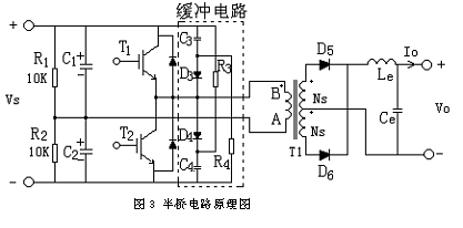 本文選用半橋電路的拓?fù)浣Y(jié)構(gòu)形式,采用電壓型反饋控制模式?!“霕螂娐返脑韴D如圖3。