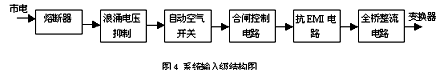 在開關(guān)整流模塊中,輸入級(jí)的結(jié)構(gòu)如圖4所示。從圖中可知,此部分主要由熔斷器、浪涌電壓抑制電路、自動(dòng)空氣開關(guān)、合閘控制電路、抗EMI電路等組成。