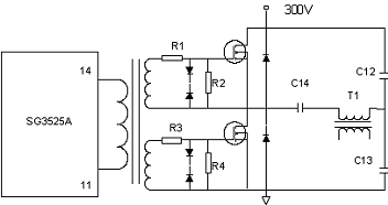 本設(shè)計(jì)中,選用變壓器驅(qū)動(dòng)方式,變壓器選用的是EI-28鐵氧體磁芯(寬28mm×高20.5mm×厚11.0mm)。由于SG3525A的供電電壓15V,驅(qū)動(dòng)變壓器的副邊繞阻需要稍許降壓,并且在柵極與源極之間并聯(lián)箝位穩(wěn)壓二極管,以防范柵極浪涌電壓損壞IRFP450功率開關(guān)管,如圖5所示。