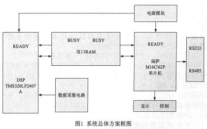 硬件平臺是軟件算法的運(yùn)行載體,是實(shí)現(xiàn)準(zhǔn)確、高效選線的保障。本文設(shè)計(jì)的選線裝置采用雙CPU。即"DSP+單片機(jī)"的處理機(jī)構(gòu)。DSP作為運(yùn)算CPU,負(fù)責(zé)信號采集、選線計(jì)算部分;單片機(jī)作為管理CPU,主要負(fù)責(zé)人機(jī)交互部分。DSP處理器由于內(nèi)部采用哈佛總線結(jié)構(gòu),指令是流水線操作,以及獨(dú)立的硬件乘法器結(jié)構(gòu)等,非常適合進(jìn)行數(shù)字信號處理,進(jìn)行實(shí)時(shí)的數(shù)據(jù)分析和監(jiān)控。本文采用TI公司的TMS320LF2407A(以下簡稱LF2407A)DSP芯片為數(shù)據(jù)采集和處理CPU,充分利用其強(qiáng)大的數(shù)據(jù)處理能力和速度,實(shí)現(xiàn)多點(diǎn)數(shù)據(jù)采集和快速參數(shù)計(jì)算。單片機(jī)采用瑞薩M16C/62P系列單片機(jī),該單片機(jī)具有很強(qiáng)的抗干擾能力和1M的尋址空間,適用于事件管理和人機(jī)交互。系統(tǒng)總體方案如圖1所示。本保護(hù)裝置位于現(xiàn)場,進(jìn)行數(shù)據(jù)采集和處理,并且與上位機(jī)之間進(jìn)行通信。保護(hù)裝置采用M16C/62P單片機(jī)為主CPU,負(fù)責(zé)系統(tǒng)顯示、控制和與上位機(jī)通信;采用TMS320LF2407ADSP為從CPU,負(fù)責(zé)數(shù)據(jù)采集和處理;DSP與單片機(jī)之間用雙端口RAM進(jìn)行通信。系統(tǒng)通過RS232和RS485與上位機(jī)通信。