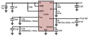 LT3050可向汽車的控制系統(tǒng)提供診斷信息。如果檢測到開路或短路情況、或者IC進(jìn)入熱停機(jī)模式,則一個(gè)能夠吸收100μA電流的集電極開路故障指示器將確定其電平。LT3050還具有一個(gè)集成電流監(jiān)視器,該電流監(jiān)視器通過IMON引腳提供約為輸出電流1/100的電流,以在天線系統(tǒng)監(jiān)視和保護(hù)中使用(見圖5)。只需在IMON和GND之間連接一個(gè)電阻器,便可產(chǎn)生一個(gè)與輸出電流成比例的參考于地的電壓。
