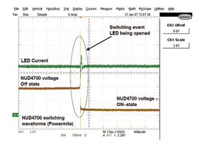 NUD4700的典型工作波形如圖6所示。圖6中,綠色是LED電流波形,棕色是NUD4700關(guān)閉狀態(tài)轉(zhuǎn)換到導(dǎo)通狀態(tài)的波形。橢圓內(nèi)是LED開路瞬間波形,此時,LED電流IF經(jīng)一些波動后恢復(fù)到原來電流;與此同時,NUD4700由關(guān)閉狀態(tài)轉(zhuǎn)換到導(dǎo)通狀態(tài),其電壓由VF下降到1~1.2V,其響應(yīng)時間是很快的(dv/dt最小值為250V/μs)。