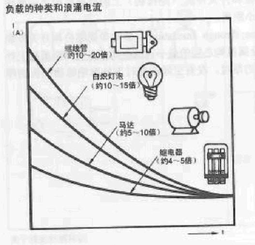 沖擊電流的產(chǎn)生和負(fù)載的種類(lèi)和特性有關(guān),和通斷頻率也有關(guān)系。特別是在有沖擊電流存在的負(fù)載的情況請(qǐng)與穩(wěn)態(tài)電流一起測(cè)定沖擊電流值。下圖顯示了有代表性的負(fù)載種類(lèi)與沖擊電流的關(guān)系。