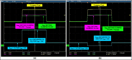 圖2是當(dāng)移走D1時(shí),35V拋負(fù)載脈沖下放大器的輸出。施加電壓為電池標(biāo)稱電壓,所要求的輸出電壓為1V (輸入VSENSE = 50mV、增益 = 20)。出現(xiàn)拋負(fù)載電壓時(shí),齊納管把輸入共模電壓鉗位在大約24V,放大器輸出經(jīng)過幾個(gè)短暫的波動后穩(wěn)定到0V。