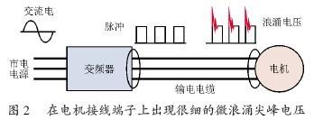 微浪涌電壓是變頻器和電機之間的接線長度很長時,在電機接線端產(chǎn)生的極細(xì)的尖峰浪涌電壓。如圖2所示,逆變器的輸出電壓是脈沖狀,在電機接線端子上發(fā)現(xiàn)在脈沖狀的波形上又疊加了微浪涌電壓尖峰。一般情況下,微浪涌電壓的尖峰值將會是逆變器內(nèi)部的直流電壓的2 倍。