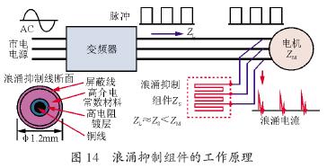 浪涌抑制組件的工作原理如圖14 所示。浪涌抑制組件內(nèi)部卷繞的浪涌抑制線具有和電纜線的阻抗ZL相同的阻抗,因此接到電機的接線端子上降低了電機接線端子的阻抗,從而減少了阻抗不匹配時的反射波。通常高頻波成分在電纜線上的阻抗ZL是50耀100 贅,設(shè)計的浪涌抑制線的阻抗ZS是50~60歐。