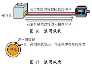 浪涌吸收:浪涌是高頻波成分,低阻抗的浪涌抑制線接在電機接線端子上,讓浪涌電流流到抑制線里面去,如圖16所示。