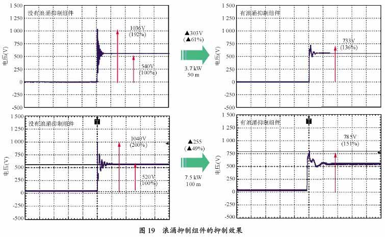 圖19 是變頻器的電源電壓為400 V,3.7 kW的電機、接線長度50 m,和75 kW的電機、接線長度100 m時抑制微浪涌電壓的效果。對于3.7 kW的電機,當(dāng)沒有浪涌抑制組件時,微浪涌電壓為1 036 V,相當(dāng)于變頻器內(nèi)部的直流電壓540 V的192%;當(dāng)加了浪涌抑制組件時,50 m電纜的峰值電壓為733 V,相當(dāng)于變頻器內(nèi)部的直流電壓540 V的136%。電壓尖峰差距303 V,有61%的抑制效果。對于75 kW的電機,當(dāng)沒有浪涌抑制組件時,微浪涌電壓為1 040 V,相當(dāng)于變頻器內(nèi)部直流電壓520 V的200%;當(dāng)加了浪涌抑制組件時,電纜的峰值電壓為785 V,相當(dāng)于變頻器內(nèi)部直流電壓520 V得151%。電壓尖峰差距255 V,有49%的抑制效果。
