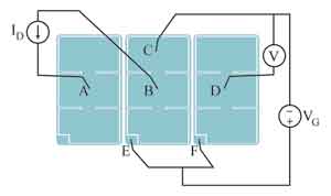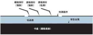 圖2顯示了測量的結(jié)構(gòu)。3個MOSFET和6個探針均在圖中顯示出來,電接觸則示意性地畫出。中間的MOSFET是待測器件。