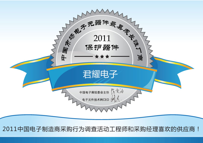 在近日剛剛結(jié)束的2011中國(guó)電子制造商采購(gòu)行為調(diào)查暨中國(guó)市場(chǎng)電子元器件領(lǐng)軍廠商的評(píng)選活動(dòng)中,君耀電子憑借本地化和快速的服務(wù)、可靠穩(wěn)定的產(chǎn)品質(zhì)量和技術(shù)指標(biāo)等多方面優(yōu)勢(shì),以及在工程師心目中形成的良好形象,一舉榮獲2011中國(guó)市場(chǎng)電子元器件保護(hù)器件類最具成長(zhǎng)性廠商稱號(hào)!