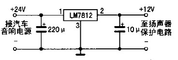 具體制作如下:先把功放輸出端與音箱的引線切斷,按圖2所示電路將引線頭a、b分別接功放的兩組輸出端,c、d分別接左、右聲道音箱:揚(yáng)聲器保護(hù)電路的電源只能從收放機(jī)中獲取,不可直接從汽車12 v電源中獲取,否則不起開/關(guān)機(jī)保護(hù)作用;若是柴油車所配置的收放機(jī)(使用24 V電源),則要求增加一個(gè)降壓電路(見圖3所示),給揚(yáng)聲器保護(hù)電路供電,以免電源電壓過高損壞IC。