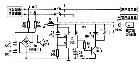 1.在接通音響電源的瞬間,因電容C3兩端電壓不能突變,可視為短路,則時(shí)基電路555的②、⑥腳電位高于2/3 Vcc,故555處于復(fù)位狀態(tài),③腳輸出低電平,晶體管VT2截止,繼電器JK常開觸點(diǎn)不動(dòng)作。同時(shí)+12 V電壓通過(guò)電阻R4向電容C3充電,延時(shí)約5s(秒鐘)后555的②、⑥腳電位降低至1/3Vcc,555被觸發(fā)置位,③腳由低電平變?yōu)楦唠娖?,晶體管VT2導(dǎo)通,繼電器JK得電,常閉觸點(diǎn)閉合,從而實(shí)現(xiàn)了延遲一段時(shí)間將揚(yáng)聲器接入功放,徹底消除了開機(jī)時(shí)大電流對(duì)揚(yáng)聲器的沖擊;