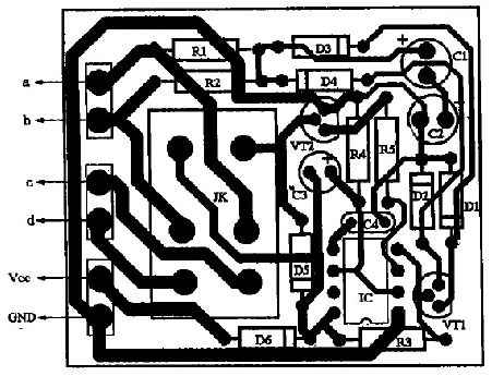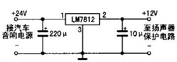 具體制作如下:先把功放輸出端與音箱的引線切斷,按圖2所示電路將引線頭a、b分別接功放的兩組輸出端,c、d分別接左、右聲道音箱:揚(yáng)聲器保護(hù)電路的電源只能從收放機(jī)中獲取,不可直接從汽車12 v電源中獲取,否則不起開/關(guān)機(jī)保護(hù)作用;若是柴油車所配置的收放機(jī)(使用24 V電源),則要求增加一個(gè)降壓電路(見圖3所示),給揚(yáng)聲器保護(hù)電路供電,以免電源電壓過(guò)高損壞IC。