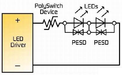 電源線耦合電壓瞬變和浪涌也可以降低LED的預(yù)期使用壽命,許多的LED驅(qū)動(dòng)器容易受到不合適的DC電壓水平和極性的破壞。LED驅(qū)動(dòng)器的輸出也可能被短路破壞或者摧毀。大多數(shù)LCD電視應(yīng)用的LED驅(qū)動(dòng)器包括內(nèi)置安全裝置,包括熱關(guān)閉以及開路、短路LCD檢測(cè)。然而,可能還需要另外的過流保護(hù)元件以幫助保護(hù)集成電路(IC)以及其它敏感的電子元件。PolySwitch元件也可以被用來幫助防止當(dāng)監(jiān)測(cè)器的冷卻口被堵塞時(shí)可能發(fā)生的熱失控情況。由于其具有對(duì)溫度過高的情況有檢測(cè)和反應(yīng)的能力,一個(gè)安裝合適的PolySwitch元件可以在LCD沒有足夠電壓運(yùn)行的情況下中斷電流?! ?br />