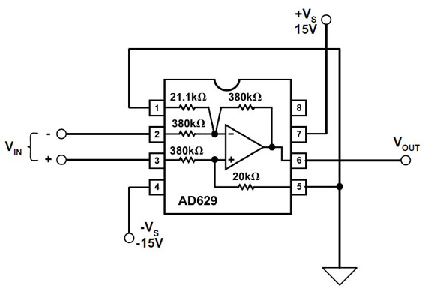 分析該拓撲結(jié)構(gòu)可知,精密運算放大器AD629周圍的阻性網(wǎng)絡(luò)充當一個分壓器,將施加于VIN的共模電壓降低20倍。AD629同時以單位增益將輸入差模信號VIN轉(zhuǎn)換成以本地接地為基準的單端輸出信號。增益誤差不超過±0.03 %或±0.05 %,失調(diào)電壓不超過0.5 mV或1 mV(取決于器件等級)。AD629的電源電壓范圍是±2.5 V至±18 V.