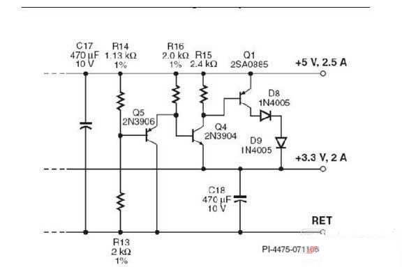 5V輸出端與3.3V輸出端的標(biāo)準(zhǔn)差異為1.7V。當(dāng)負(fù)載要求從3.3V輸出端獲得額外的電流,而從5V輸出端輸出的負(fù)載電流并未等量增加時(shí),其輸出電壓與3.3V輸出端的電壓相比將會(huì)升高。由于電壓差異約超過(guò)100 mV,Q5將偏置截止,從而導(dǎo)通Q4和Q1并允許電流從5V輸出端流到3.3V輸出端。該電流將降低5V輸出端的電壓,進(jìn)而縮小兩個(gè)輸出端之間的電壓差異。