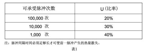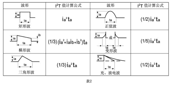 脈沖產(chǎn)生熱循環(huán),從而產(chǎn)生機(jī)械疲勞影響保險(xiǎn)絲管壽命。設(shè)計(jì)時(shí)應(yīng)使脈沖I2T遠(yuǎn)遠(yuǎn)小于保險(xiǎn)絲管標(biāo)稱熔化熱能I2T。保險(xiǎn)絲管壽命(可承載的脈沖循環(huán)次數(shù))與U(脈沖I2T值之比率)的關(guān)系參照表1.本目錄提供的各種規(guī)格的保險(xiǎn)絲管熔化熱能I2T可供參考,表2提供各種典型脈沖波形的I2T值近似計(jì)算公式: