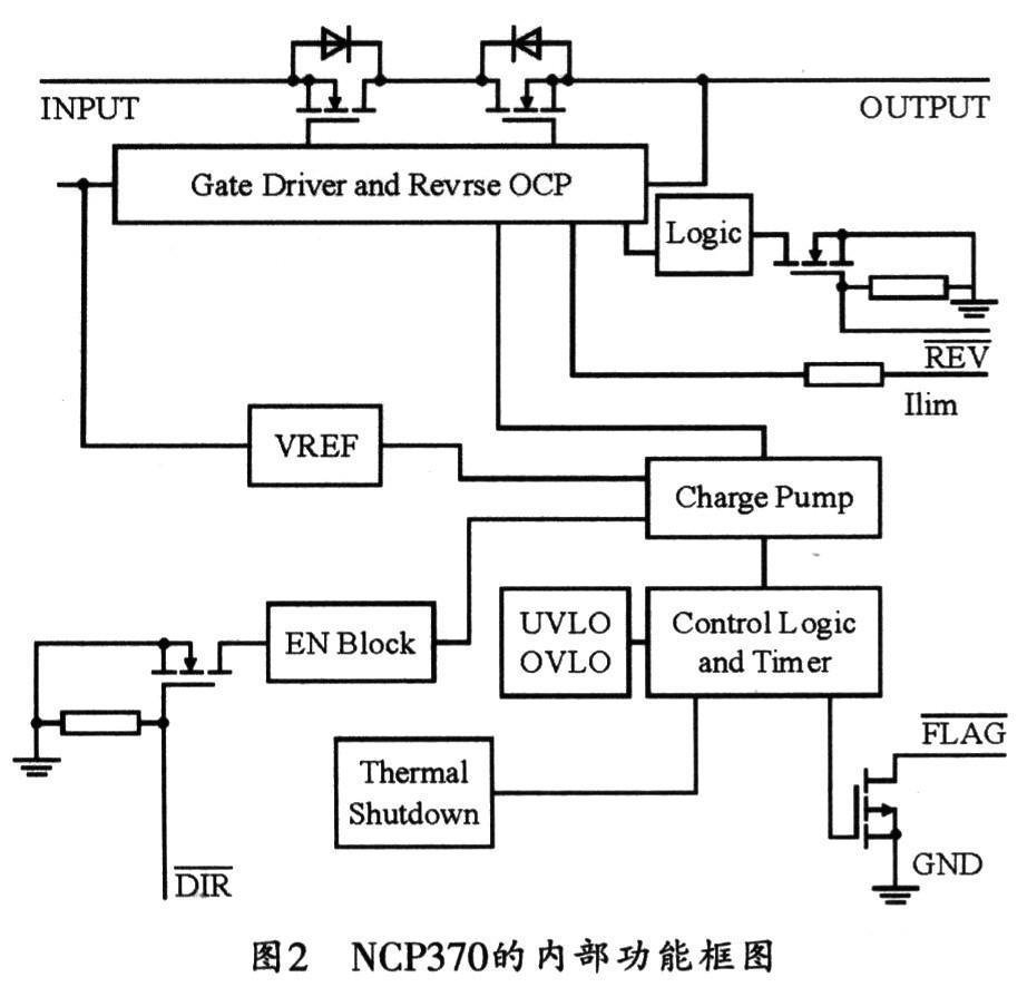 將外設(shè)連到IN端,NCP370便可進(jìn)入反向模式。此時(shí),外設(shè)內(nèi)部的電池可由NCP370的OUT端來供電。在反向模式下,NCP370的REV端必須置低,這樣,當(dāng)外設(shè)發(fā)生過壓、欠壓或過流等故障時(shí),NCP370內(nèi)部的過壓、欠壓或過流保護(hù)電路才會(huì)起作用,同時(shí)其FLAG也才會(huì)向系統(tǒng)發(fā)出報(bào)警信號(hào)。圖2所示是NCP370的內(nèi)部功能框圖。