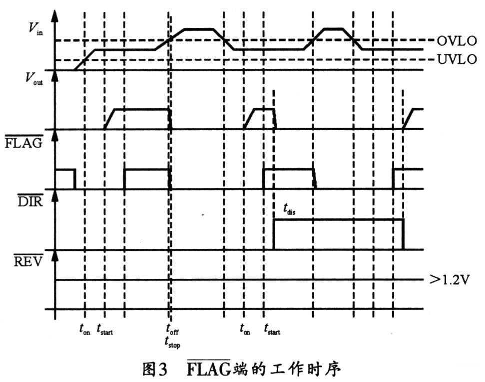 NCP370內(nèi)含一個(gè)FLAG報(bào)警提示引腳。一旦NCP370檢測(cè)到輸入電壓高于OVLO閥值、低于U-VLO閥值或過流、過壓等故障,F(xiàn)LAG端就會(huì)置低,并通知微控制器采取適當(dāng)?shù)拇胧?。而?dāng)輸入電壓恢復(fù)到正常范圍時(shí),F(xiàn)IAG又會(huì)在經(jīng)過一個(gè)延遲后置高,隨后使Vout恢復(fù)輸出,其工作時(shí)序如圖3所示。
