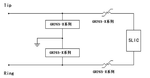 目前本公生產(chǎn)的GR265-X和GR600-X 等系列高分子PTC 熱敏電阻和半導(dǎo)體固體放電管一起用于總配線架的保安單元中,可以滿足過流和過壓保護(hù)的要求,同時幫助保安單元滿足中國通信行業(yè)標(biāo)準(zhǔn) YD/T 694-1999-2002、北美 TelcordiaGR-974 及 ITU-T K.20 等標(biāo)準(zhǔn),典型的使用電路如上圖所示。