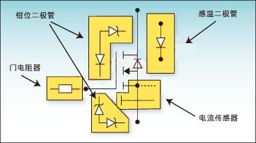 突出顯示的元件組成一個特性板,可以將其中的功能集成到MOSFET中。這些元件從右上角開始按順時針方向為:溫度感應(yīng)二極管、電流傳感器、鉗位二極管(內(nèi)部二極管,未顯示)和門電阻器。通過加入鉗位二極管和門電阻器眾所周知的保護特性,可以保護對電壓敏感的柵氧化層免受危險電場的破壞。