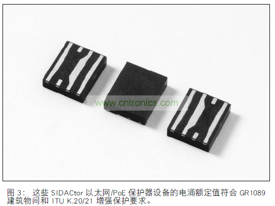 三級(jí)或芯片側(cè)方法是一個(gè) TVS 二極管軌鉗位陣列,即TVS3,它可以在耦合變壓器之后提供額外的保護(hù)。 BobSmith 終端是一種減少數(shù)據(jù)對(duì)以一致的方法相互關(guān)聯(lián)的多對(duì)導(dǎo)體系統(tǒng)上縱向或共模電流的方法。如果使用Bob Smith終端,您應(yīng)對(duì)終端進(jìn)行電容隔離,從而使它們不會(huì)承載PoE 電源。 這種組合式金屬/微分和縱向/共模保護(hù)方法需要在傳輸對(duì)和接收對(duì)的導(dǎo)線上安裝保險(xiǎn)絲。
