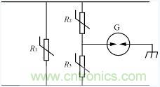 圖4是氣體放電管和壓敏電阻組合構(gòu)成的浪涌抑制電路。由于壓敏電阻有一致命缺點:具有不穩(wěn)定的漏電流,性能較差的壓敏電阻使用一段時間后,因漏電流變大可能會發(fā)熱自爆。為解決這一問題在壓敏電阻之間串入氣體放電管。但這又帶來了缺點就是反應(yīng)時間為各器件的反應(yīng)時間之和。例如壓敏電阻的反應(yīng)時間為25ns,氣體放電管的反應(yīng)時間為100ns,則圖4的R2,G,R3的反應(yīng)時間為150ns,為改善反應(yīng)時間加入R1壓敏電阻,這樣可使反應(yīng)時間為25ns。