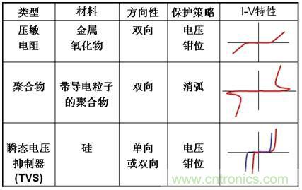 安森美半導(dǎo)體來(lái)自美國(guó)的ESD保護(hù)專家Robert Ashton博士說(shuō),一般而言,ESD保護(hù)元件的分類可以通過(guò)其保護(hù)策略與方向性來(lái)進(jìn)行,主要包括壓敏電阻、聚合物和瞬態(tài)電壓抑 制器(TVS)等,如表1所示。在這幾種保護(hù)元件中,壓敏電阻在低電壓時(shí),呈現(xiàn)出高電阻,其中的每個(gè)小型二極管兩端的電壓都相當(dāng)?shù)停瑫r(shí)電流也相當(dāng)?。欢谳^高電壓時(shí),其中的獨(dú)立二極管開(kāi)始導(dǎo)通,同時(shí)壓敏電阻的電阻會(huì)下降。從表1中我們也可以看出壓敏電阻為雙向保護(hù)元件。而對(duì)于帶導(dǎo)電粒子的聚合物而言,在正常電壓下,這些材料擁有相當(dāng)高的電阻,但當(dāng)發(fā)生ESD沖擊時(shí),導(dǎo)電粒子間的小間隙會(huì)成為突波音隙陣列,從而帶來(lái)低電阻路徑。